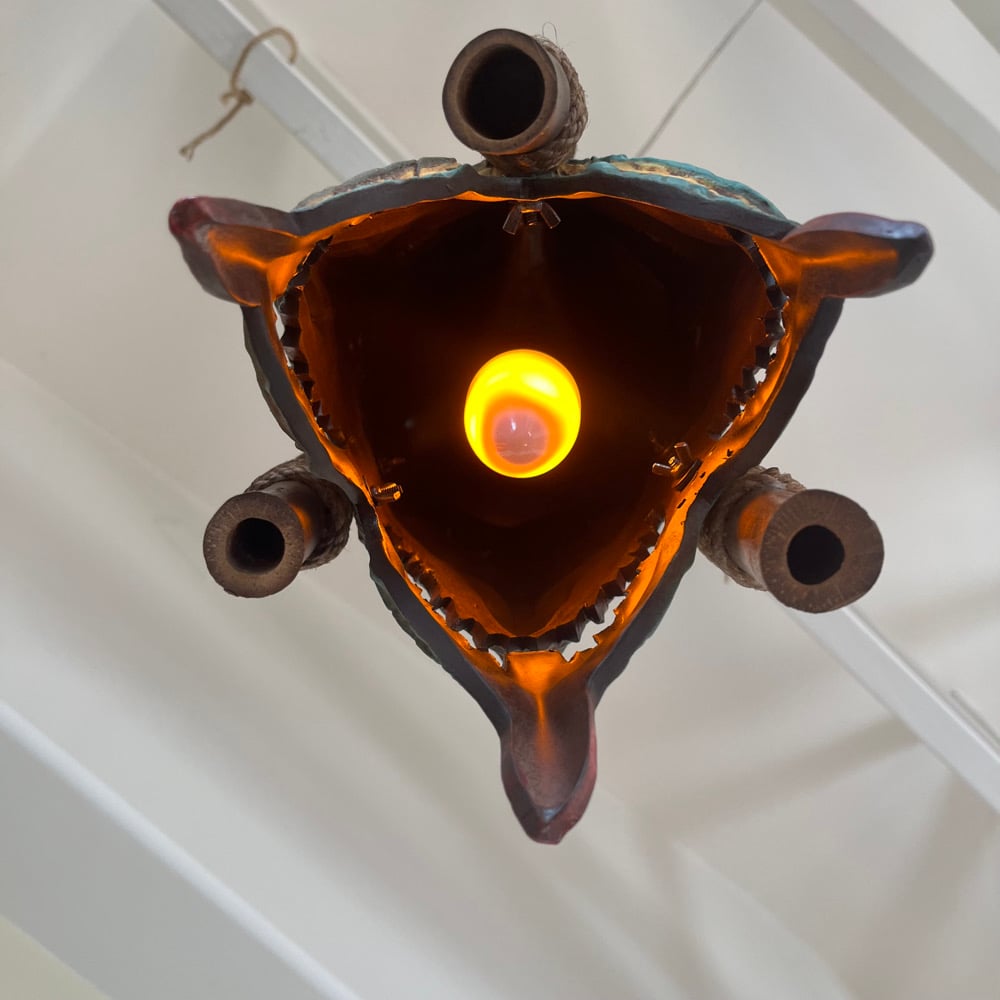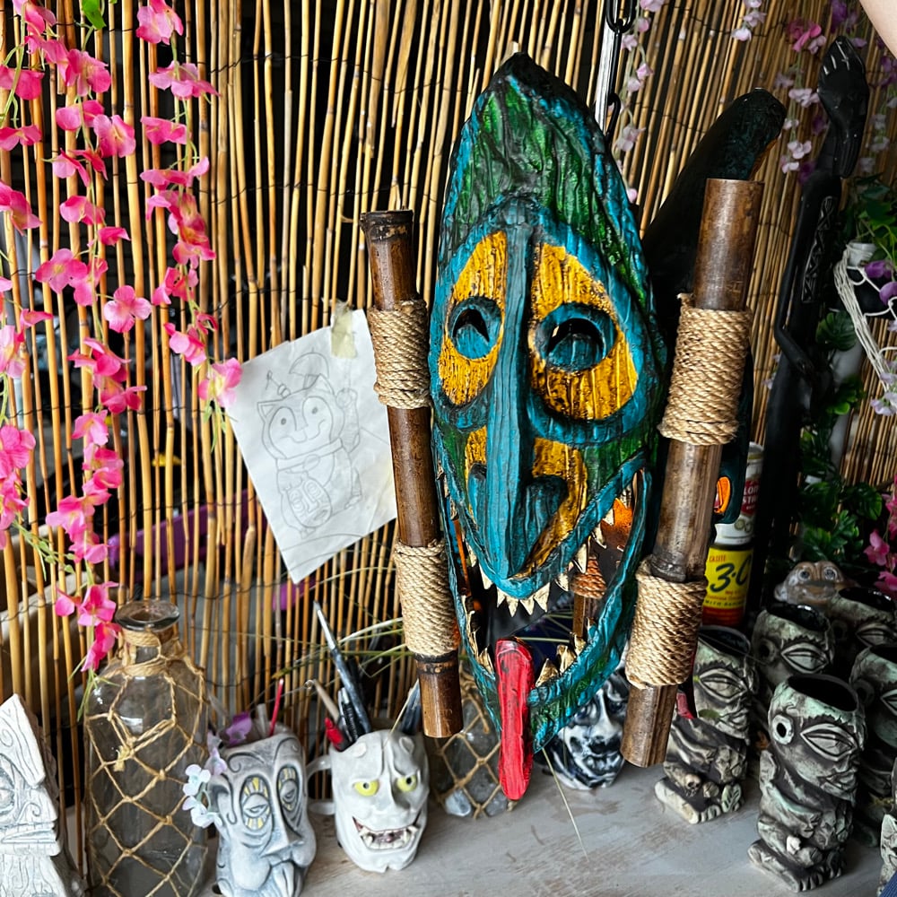 Enhance your tiki atmosphere with this hand made enchanted tiki lamp. Each lamp is slipcasted by hand from stoneware clay and is rigged together with bamboo fixtures. These mask lamps stand at 15 inches tall and a diameter of 8 inches. Flickering e26 led lightbulb and mounting supplies all included.