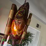 Enhance your tiki atmosphere with this hand made enchanted tiki lamp. Each lamp is slipcasted by hand from stoneware clay and is rigged together with bamboo fixtures. These mask lamps stand at 15 inches tall and a diameter of 8 inches. Flickering e26 led lightbulb and mounting supplies all included.